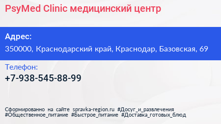 PsyMed Clinic, медицинский центр по адресу 350000, Краснодарский край, Краснодар, Базовская, 69 в дальнейшем Организация, размещена в следующих категориях: