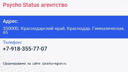 Psycho Status, агентство по адресу 350000, Краснодарский край, Краснодар, Гимназическая, 65 в дальнейшем Организация, размещена в следующих категориях: