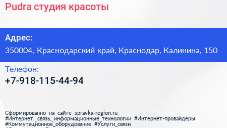 Pudra, студия красоты по адресу 350004, Краснодарский край, Краснодар, Калинина, 150 в дальнейшем Организация, размещена в следующих категориях: