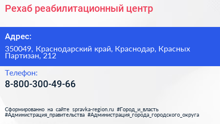 Рехаб, реабилитационный центр по адресу 350049, Краснодарский край, Краснодар, Красных Партизан, 212 в дальнейшем Организация, размещена в следующих категориях: