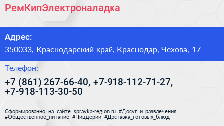 РемКипЭлектроналадка по адресу 350033, Краснодарский край, Краснодар, Чехова, 17 в дальнейшем Организация, размещена в следующих категориях: