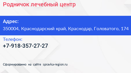 Родничок, лечебный центр по адресу 350004, Краснодарский край, Краснодар, Головатого, 174 в дальнейшем Организация, размещена в следующих категориях: