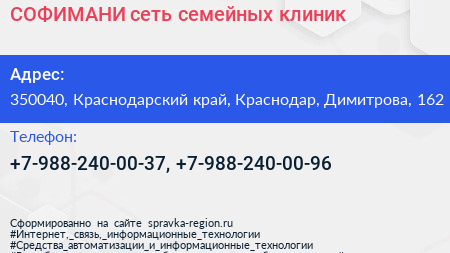 СОФИМАНИ, сеть семейных клиник по адресу 350040, Краснодарский край, Краснодар, Димитрова, 162 в дальнейшем Организация, размещена в следующих категориях: