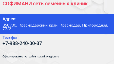 СОФИМАНИ, сеть семейных клиник по адресу 350900, Краснодарский край, Краснодар, Пригородная, 77/2 в дальнейшем Организация, размещена в следующих категориях: