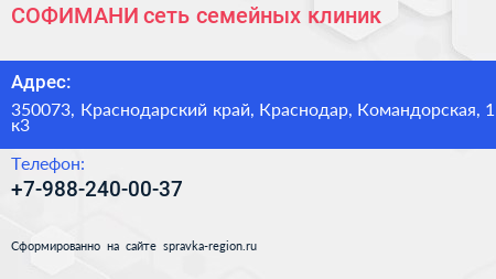 СОФИМАНИ, сеть семейных клиник по адресу 350073, Краснодарский край, Краснодар, Командорская, 1 к3 в дальнейшем Организация, размещена в следующих категориях: