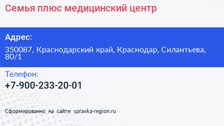 Семья плюс, медицинский центр по адресу 350087, Краснодарский край, Краснодар, Силантьева, 80/1 в дальнейшем Организация, размещена в следующих категориях: