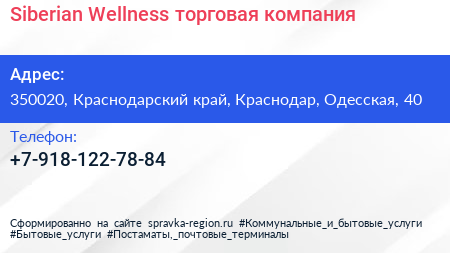 Siberian Wellness, торговая компания по адресу 350020, Краснодарский край, Краснодар, Одесская, 40 в дальнейшем Организация, размещена в следующих категориях: