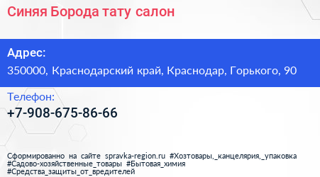 Синяя Борода, тату-салон по адресу 350000, Краснодарский край, Краснодар, Горького, 90 в дальнейшем Организация, размещена в следующих категориях: