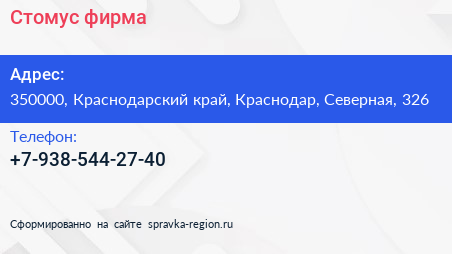 Для связи с организацией воспользуйтесь номером телефона: +7-938-544-27-40. Пн: c 09:00-18:00, Вт: c 09:00-18:00, Ср: c 09:00-18:00, Чт: c 09:00-18:00, Пт: c 09:00-18:00, Сб: выходной, Вс: выходной, вы можете обратиться в эту организацию.