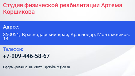 Студия физической реабилитации Артема Коршикова по адресу 350051, Краснодарский край, Краснодар, Монтажников, 14 в дальнейшем Организация, размещена в следующих категориях:
