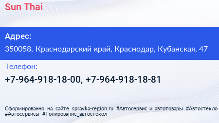 Sun Thai по адресу 350058, Краснодарский край, Краснодар, Кубанская, 47 в дальнейшем Организация, размещена в следующих категориях: