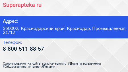 Superapteka.ru по адресу 350002, Краснодарский край, Краснодар, Промышленная, 21/12 в дальнейшем Организация, размещена в следующих категориях: