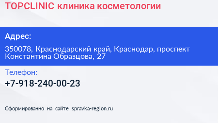 TOPCLINIC, клиника косметологии по адресу 350078, Краснодарский край, Краснодар, проспект Константина Образцова, 27 в дальнейшем Организация, размещена в следующих категориях: