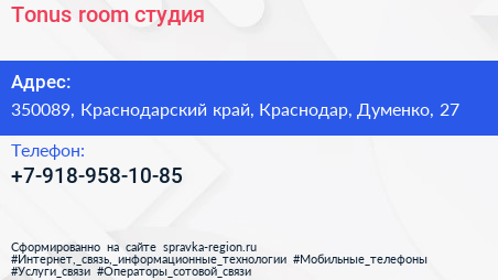 Tonus room, студия по адресу 350089, Краснодарский край, Краснодар, Думенко, 27 в дальнейшем Организация, размещена в следующих категориях: