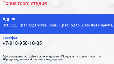 Tonus room, студия по адресу 350911, Краснодарский край, Краснодар, Василия Мачуги, 41 в дальнейшем Организация, размещена в следующих категориях: