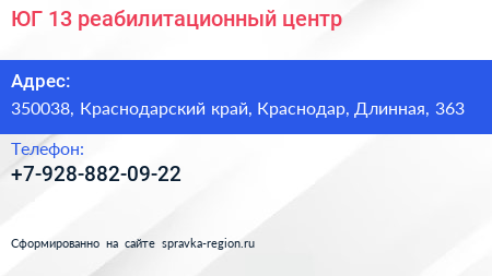 ЮГ 13, реабилитационный центр по адресу 350038, Краснодарский край, Краснодар, Длинная, 363 в дальнейшем Организация, размещена в следующих категориях: