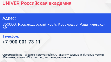 UNIVER, Российская академия по адресу 350000, Краснодарский край, Краснодар, Рашпилевская, 69 в дальнейшем Организация, размещена в следующих категориях:
