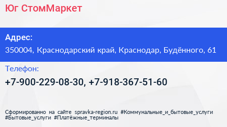Юг-СтомМаркет по адресу 350004, Краснодарский край, Краснодар, Будённого, 61 в дальнейшем Организация, размещена в следующих категориях: