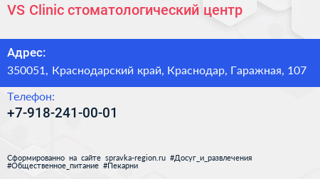 VS Clinic, стоматологический центр по адресу 350051, Краснодарский край, Краснодар, Гаражная, 107 в дальнейшем Организация, размещена в следующих категориях:
