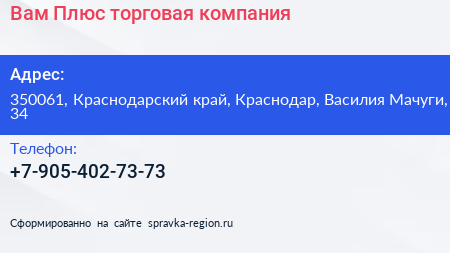 Вам Плюс, торговая компания по адресу 350061, Краснодарский край, Краснодар, Василия Мачуги, 34 в дальнейшем Организация, размещена в следующих категориях: