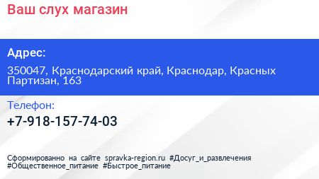 Ваш слух, магазин по адресу 350047, Краснодарский край, Краснодар, Красных Партизан, 163 в дальнейшем Организация, размещена в следующих категориях: