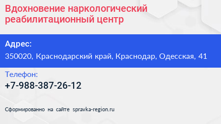 Вдохновение, наркологический реабилитационный центр по адресу 350020, Краснодарский край, Краснодар, Одесская, 41 в дальнейшем Организация, размещена в следующих категориях: