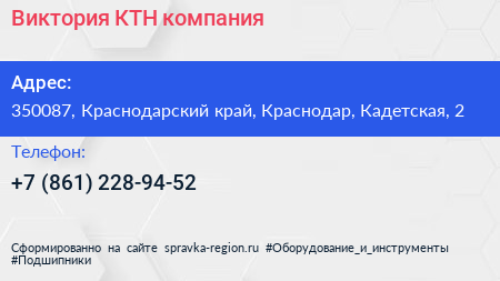Виктория КТН, компания по адресу 350087, Краснодарский край, Краснодар, Кадетская, 2 в дальнейшем Организация, размещена в следующих категориях: