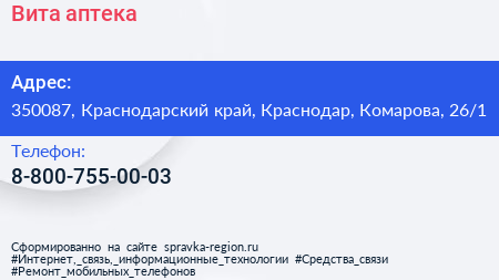 Вита, аптека по адресу 350087, Краснодарский край, Краснодар, Комарова, 26/1 в дальнейшем Организация, размещена в следующих категориях:
