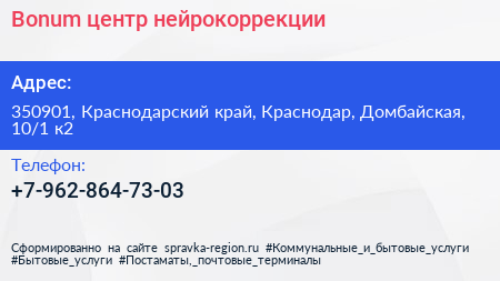 Вonum, центр нейрокоррекции по адресу 350901, Краснодарский край, Краснодар, Домбайская, 10/1 к2 в дальнейшем Организация, размещена в следующих категориях: