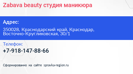 Zabava beauty, студия маникюра по адресу 350028, Краснодарский край, Краснодар, Восточно-Кругликовская, 30/1 в дальнейшем Организация, размещена в следующих категориях: