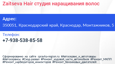 Zaitseva Hair, студия наращивания волос по адресу 350051, Краснодарский край, Краснодар, Монтажников, 5 в дальнейшем Организация, размещена в следующих категориях: