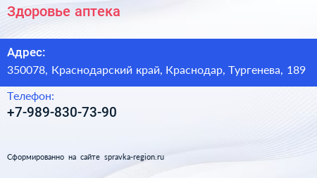Здоровье, аптека по адресу 350078, Краснодарский край, Краснодар, Тургенева, 189 в дальнейшем Организация, размещена в следующих категориях: