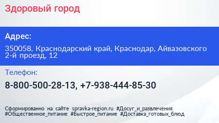 Здоровый город по адресу 350058, Краснодарский край, Краснодар, Айвазовского 2-й проезд, 12 в дальнейшем Организация, размещена в следующих категориях:
