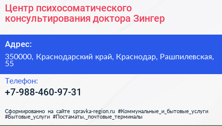 Центр психосоматического консультирования доктора Зингер по адресу 350000, Краснодарский край, Краснодар, Рашпилевская, 55 в дальнейшем Организация, размещена в следующих категориях: