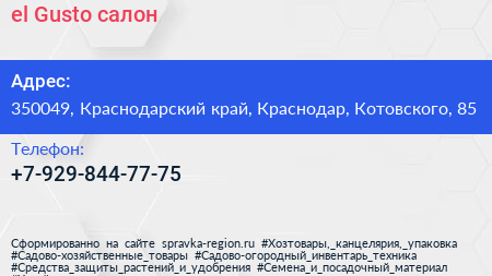 el Gusto, салон по адресу 350049, Краснодарский край, Краснодар, Котовского, 85 в дальнейшем Организация, размещена в следующих категориях:
