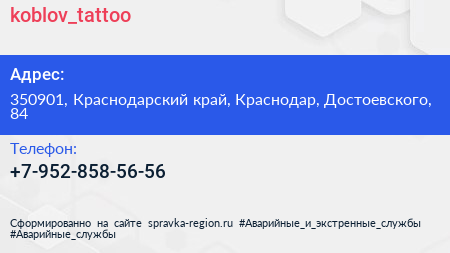 koblov_tattoo по адресу 350901, Краснодарский край, Краснодар, Достоевского, 84 в дальнейшем Организация, размещена в следующих категориях: