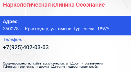 Наркологическая клиника «Осознание» по адресу 350078 г. Краснодар, ул. имени Тургенева, 189/5 в дальнейшем Организация, размещена в следующих категориях: