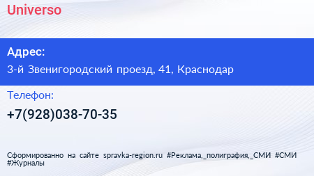 Universo по адресу 3-й Звенигородский проезд, 41, Краснодар в дальнейшем Организация, размещена в следующих категориях: