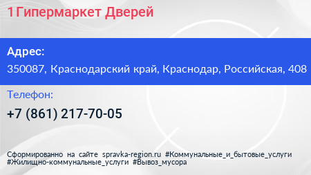 1 Гипермаркет Дверей по адресу 350087, Краснодарский край, Краснодар, Российская, 408 в дальнейшем Организация, размещена в следующих категориях:
