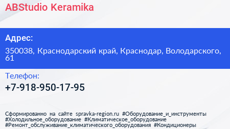 ABStudio Keramika по адресу 350038, Краснодарский край, Краснодар, Володарского, 61 в дальнейшем Организация, размещена в следующих категориях: