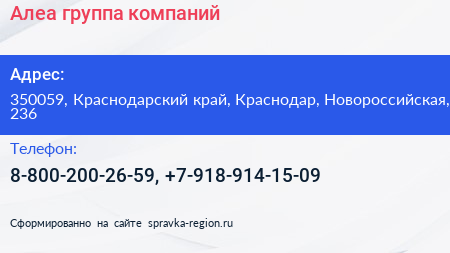 Алеа, группа компаний по адресу 350059, Краснодарский край, Краснодар, Новороссийская, 236 в дальнейшем Организация, размещена в следующих категориях: