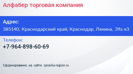 Алфабер, торговая компания по адресу 385140, Краснодарский край, Краснодар, Ленина, 39а к3 в дальнейшем Организация, размещена в следующих категориях: