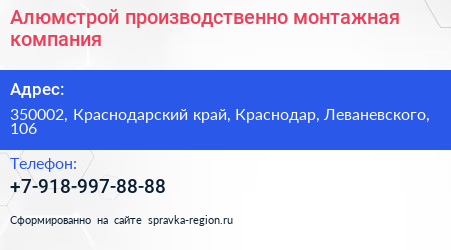 Алюмстрой, производственно-монтажная компания по адресу 350002, Краснодарский край, Краснодар, Леваневского, 106 в дальнейшем Организация, размещена в следующих категориях: