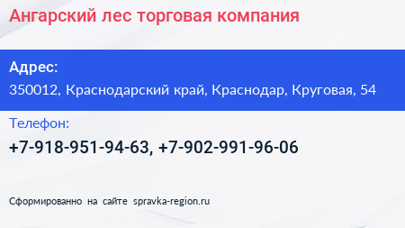 Ангарский лес, торговая компания по адресу 350012, Краснодарский край, Краснодар, Круговая, 54 в дальнейшем Организация, размещена в следующих категориях: