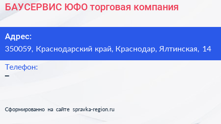 БАУСЕРВИС ЮФО, торговая компания по адресу 350059, Краснодарский край, Краснодар, Ялтинская, 14 в дальнейшем Организация, размещена в следующих категориях:
