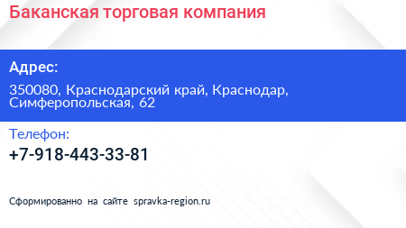 Баканская торговая компания по адресу 350080, Краснодарский край, Краснодар, Симферопольская, 62 в дальнейшем Организация, размещена в следующих категориях: