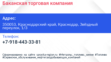 Баканская торговая компания по адресу 350053, Краснодарский край, Краснодар, Звёздный переулок, 1/3 в дальнейшем Организация, размещена в следующих категориях: