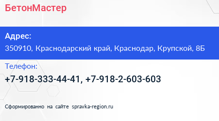 БетонМастер по адресу 350910, Краснодарский край, Краснодар, Крупской, 8Б в дальнейшем Организация, размещена в следующих категориях: