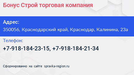 Бонус Строй, торговая компания по адресу 350056, Краснодарский край, Краснодар, Калинина, 23а в дальнейшем Организация, размещена в следующих категориях: