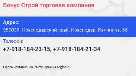 Бонус Строй, торговая компания по адресу 350039, Краснодарский край, Краснодар, Калинина, 56 в дальнейшем Организация, размещена в следующих категориях:
